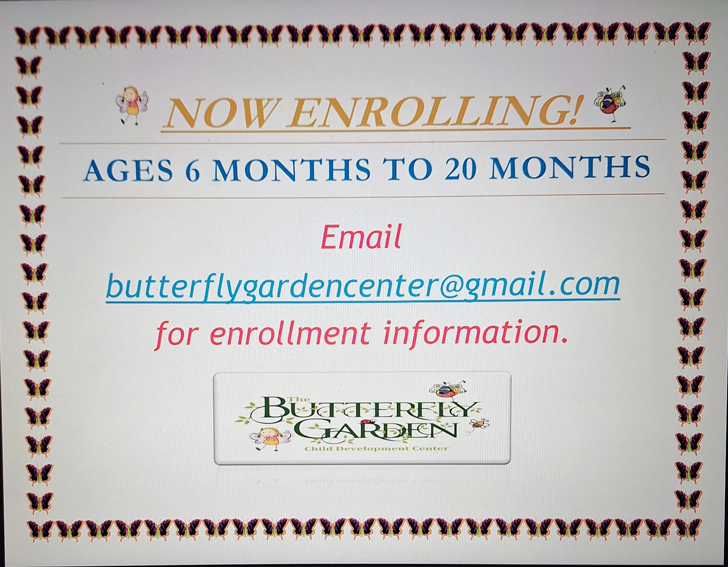 We serve 6mth to 10yr old (Siblings After-School), Full-Time, M-F 7a-6p. We prefer to schedule visits at 9:30am. That is the best time for the classrooms. Let us know when you are available to bring your Caterpillar/Butterfly to visit the Garden!